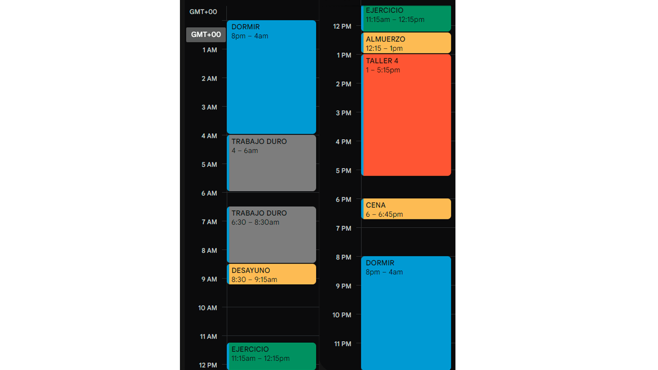 Luego, te concentrarás en tus horarios de Responsabilidades. Aquí es donde tus horas de sueño y comidas pueden variar. Todo según el horario de clases o de trabajo que tengas. En este caso, estaré colocando uno de los cursos que llevaré el próximo año: Taller 4 (Proyecto Arquitectónico). Tal vez el desayuno se mueva a las 6 de la mañana. Tal vez el almuerzo se retraiga hasta las 3 de la tarde. Puede ser que no tengas nada que hacer en la noche y te permitas dormir más temprano, haremos eso en este ejemplo.